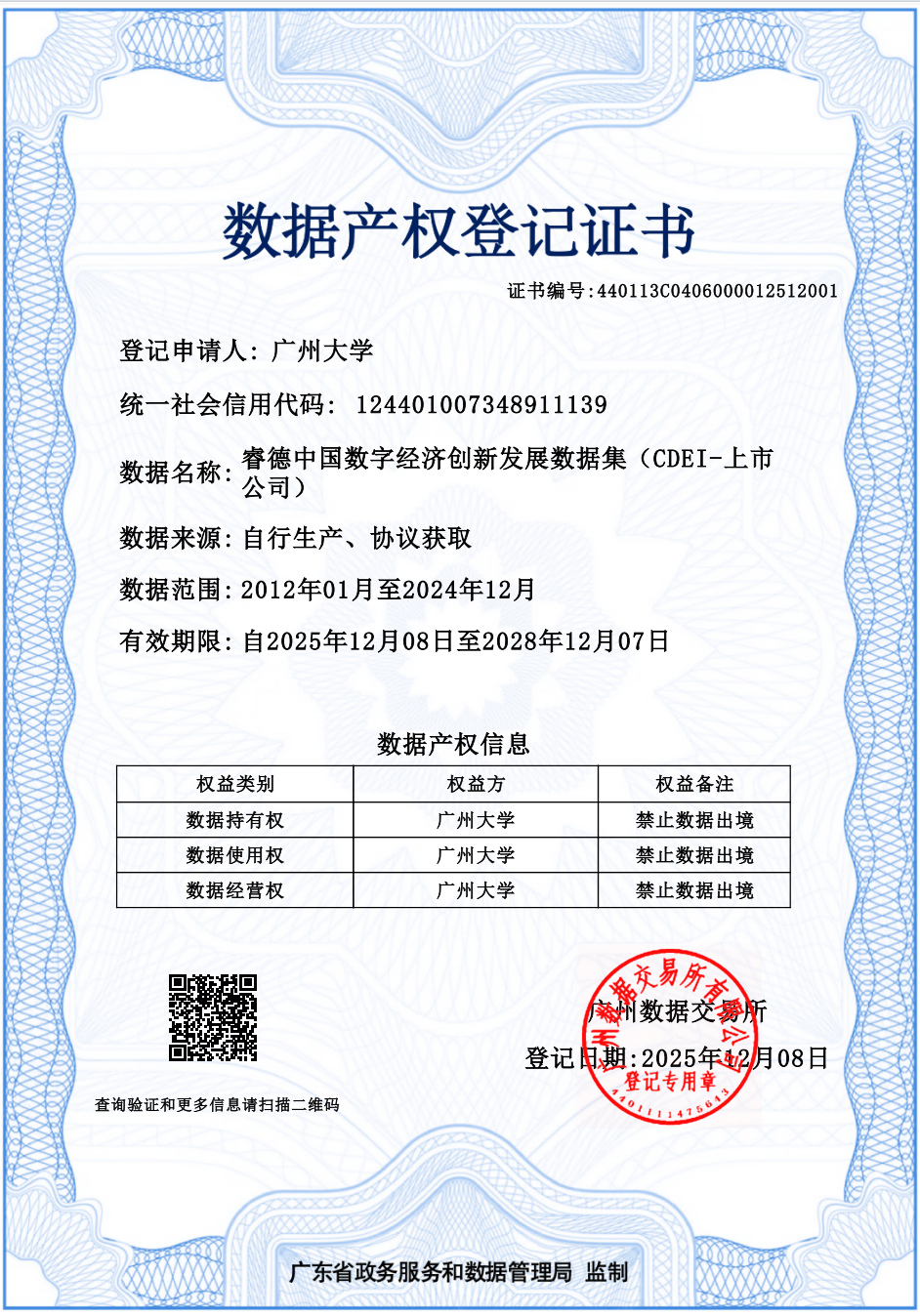 近日,由广州大学贬责学院数字经济革命贬责筹商团队(国度工信安全中心-广州大学数字经济革命发展筹商院、新华网-广州大学数字经济履行室)研发的“睿德中国数字经济革命发展数据集(CDEI-上市公司)”,在广州数据往复所成效完成数据产权登记。广州大学由此成为广东省内首个在广州数据往复所取得数据产权登记文凭的高校,标识着广东高校在数据钞票化与贬责革命方面走在天下前线。